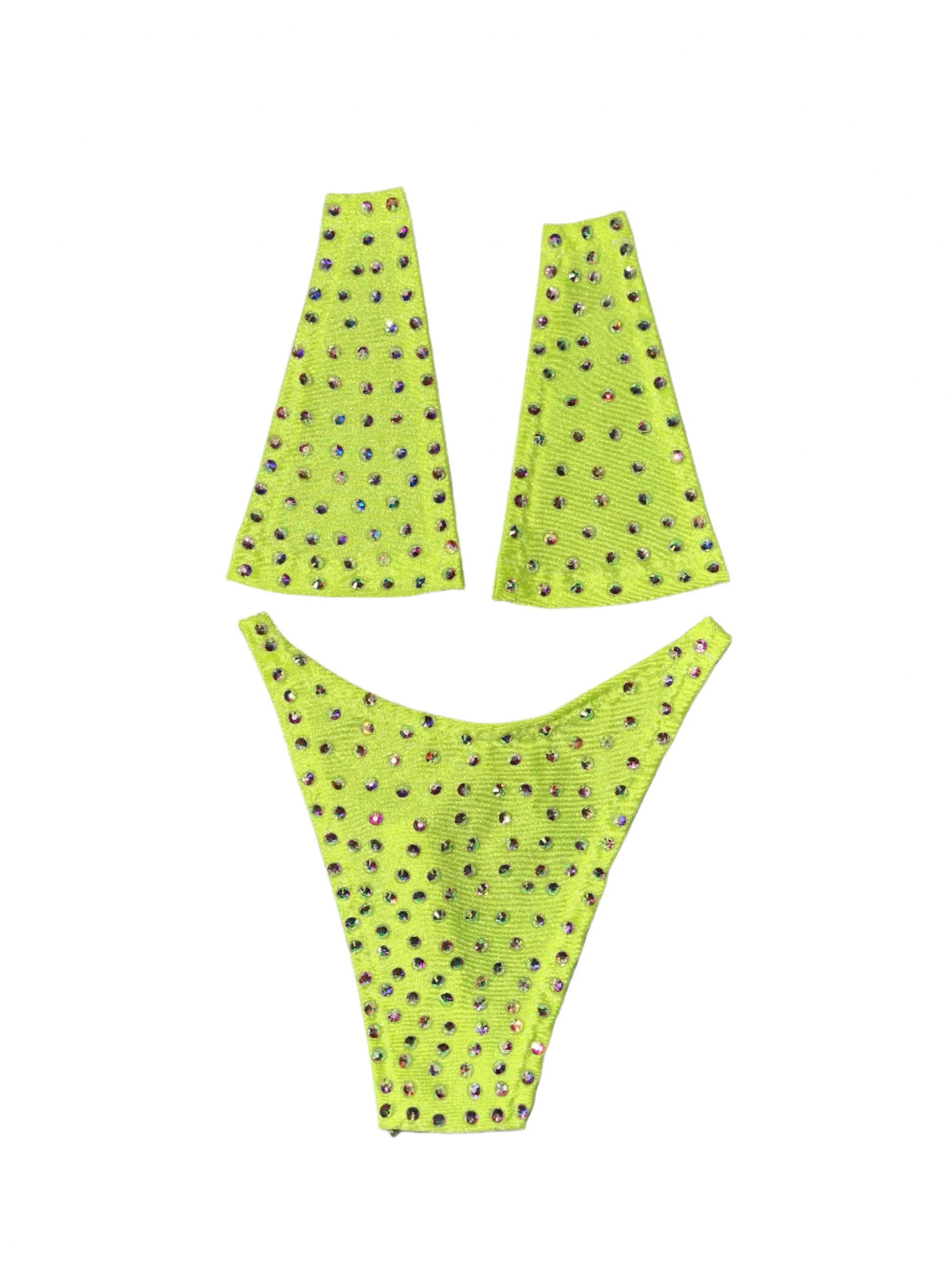 Top ties around neck and back. Thong goes on in one piece. Both pieces tie with clear "invisible string" elastic (you may need to tie it off for your perfect fit).
