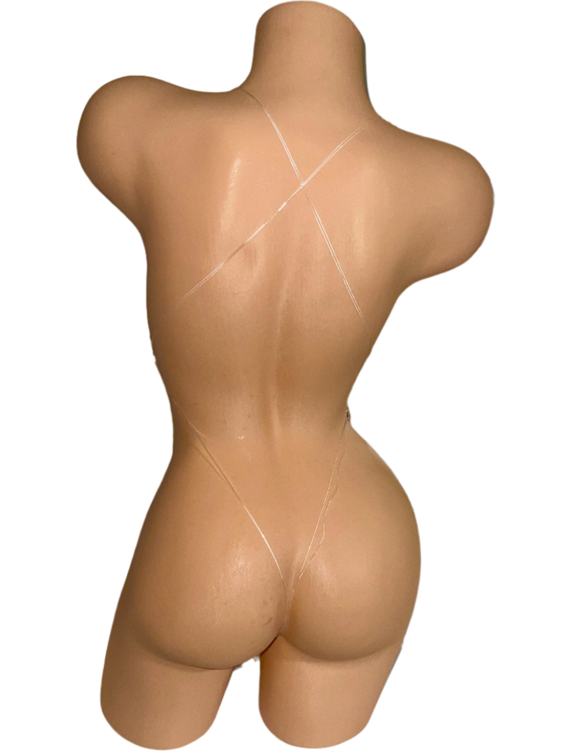 Onesie goes on in one piece and has a thick clear string to give a naked back look. Fabric is bedazzled all over with AB tone crystals.